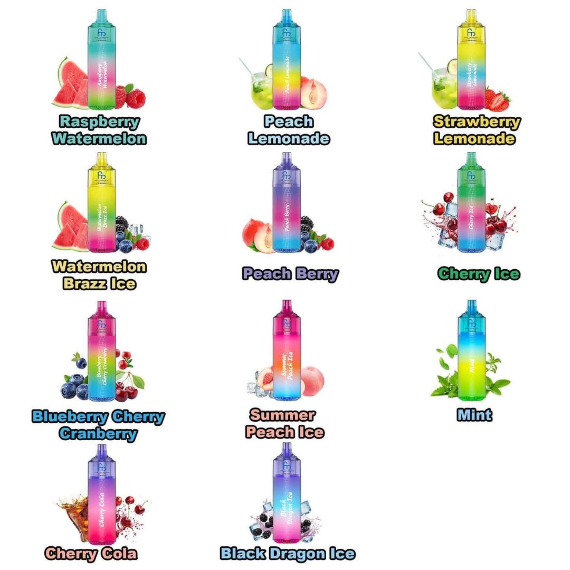 Black Dragon Ice ,Blue Razz Ice ,Blueberry Cherry Cranberry ,Blueberry Raspberry ,Cherry Cola ,Cherry Ice ,Kiwi Passion Fruit Guava ,Mint ,Mixed Berries ,Mr Blue ,Peach Berry ,Peach Lemonade ,Peach Mango Pineapple ,Raspberry Watermelon ,Strawberry Lemonade ,Strawberry Watermelon ,Summer Peach Ice ,Watermelon Brazz Ice ,Watermelon Bubble Gum ,Watermelon Ice |
