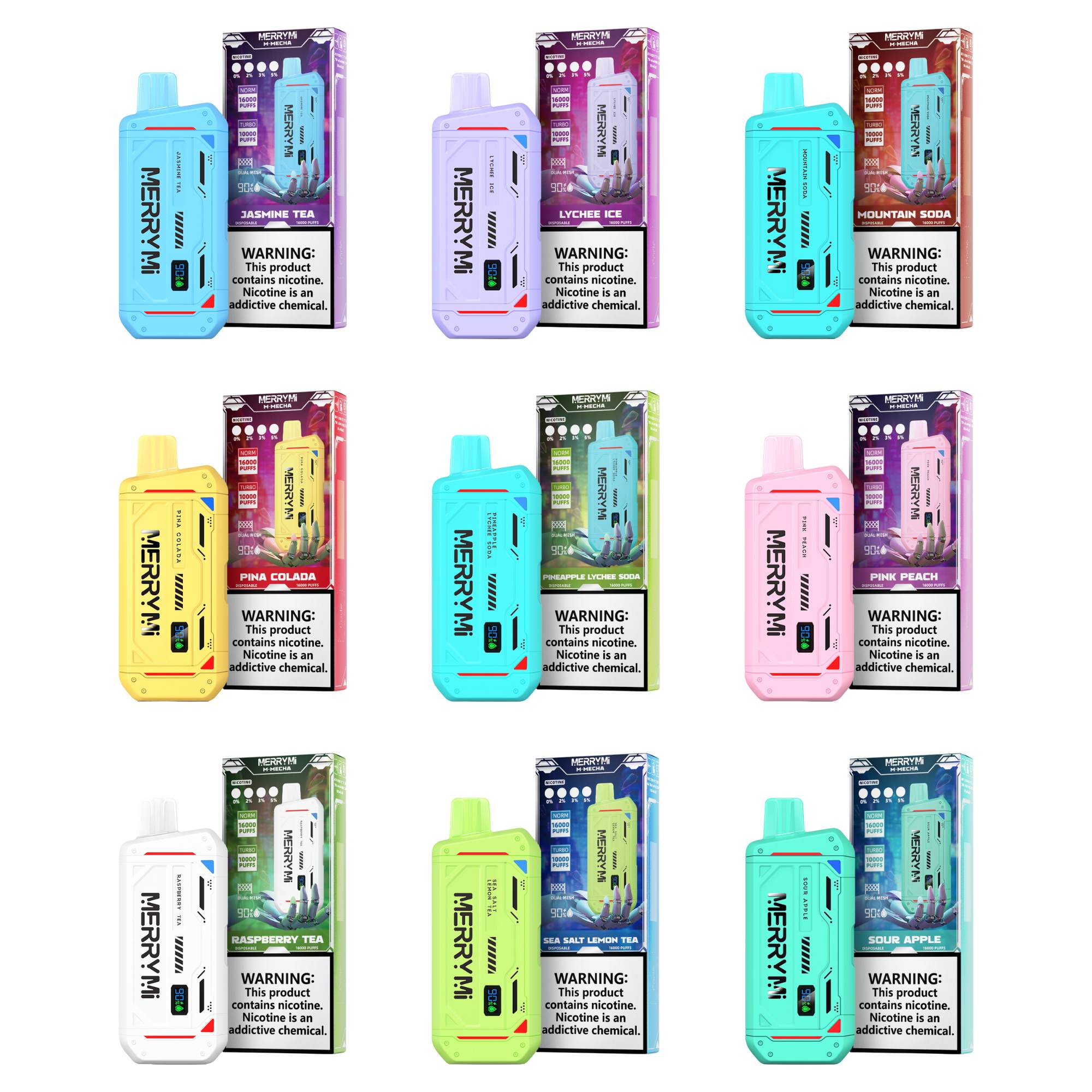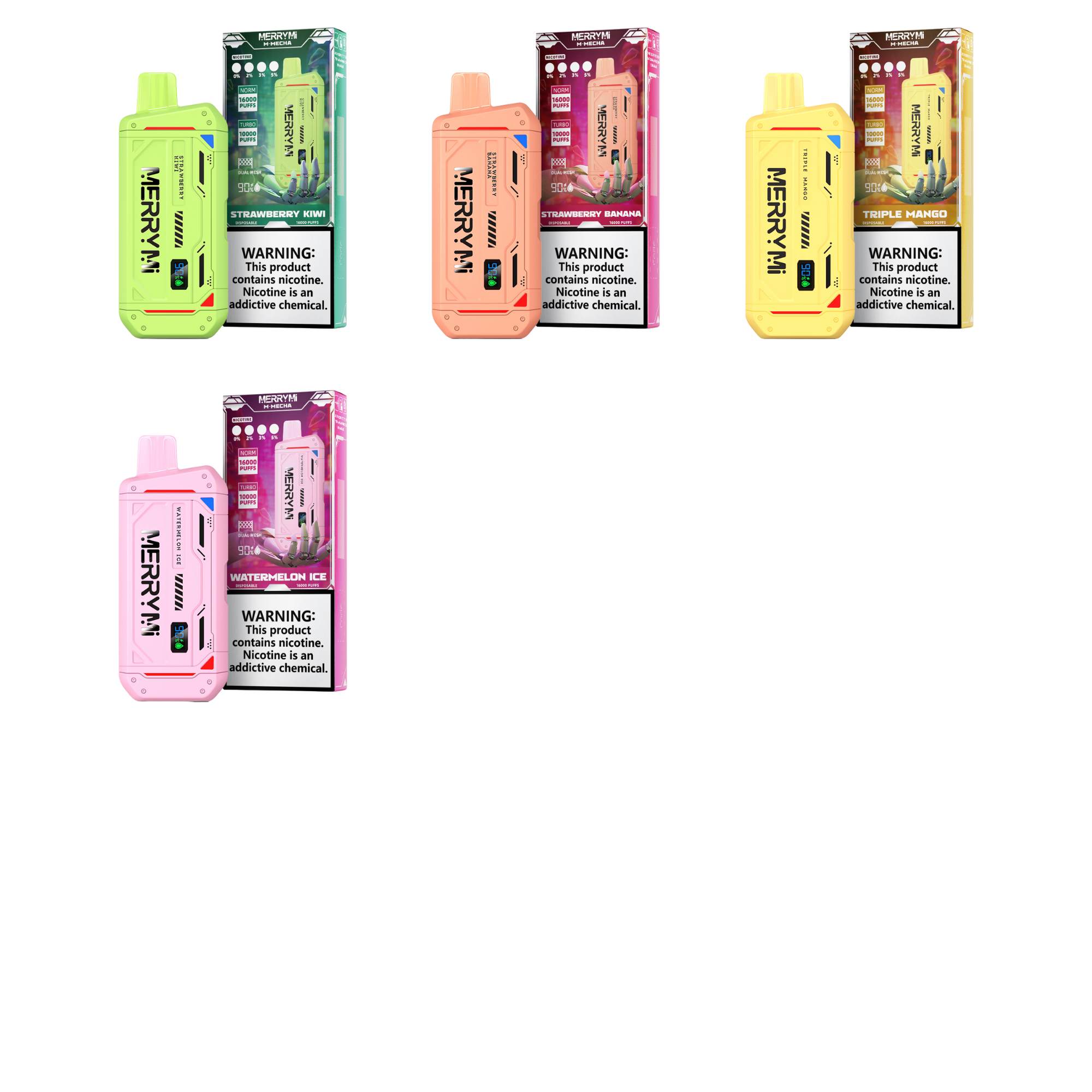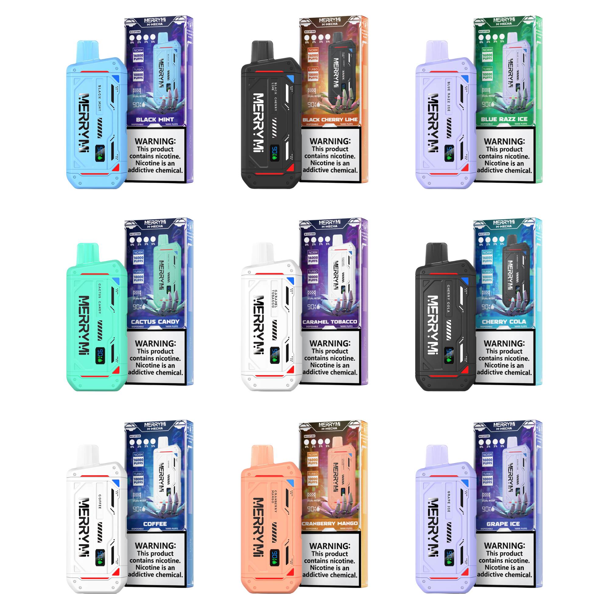 Die MerryMi M-Mecha 16K ist in folgenden beliebten Geschmacksrichtungen erhältlich: